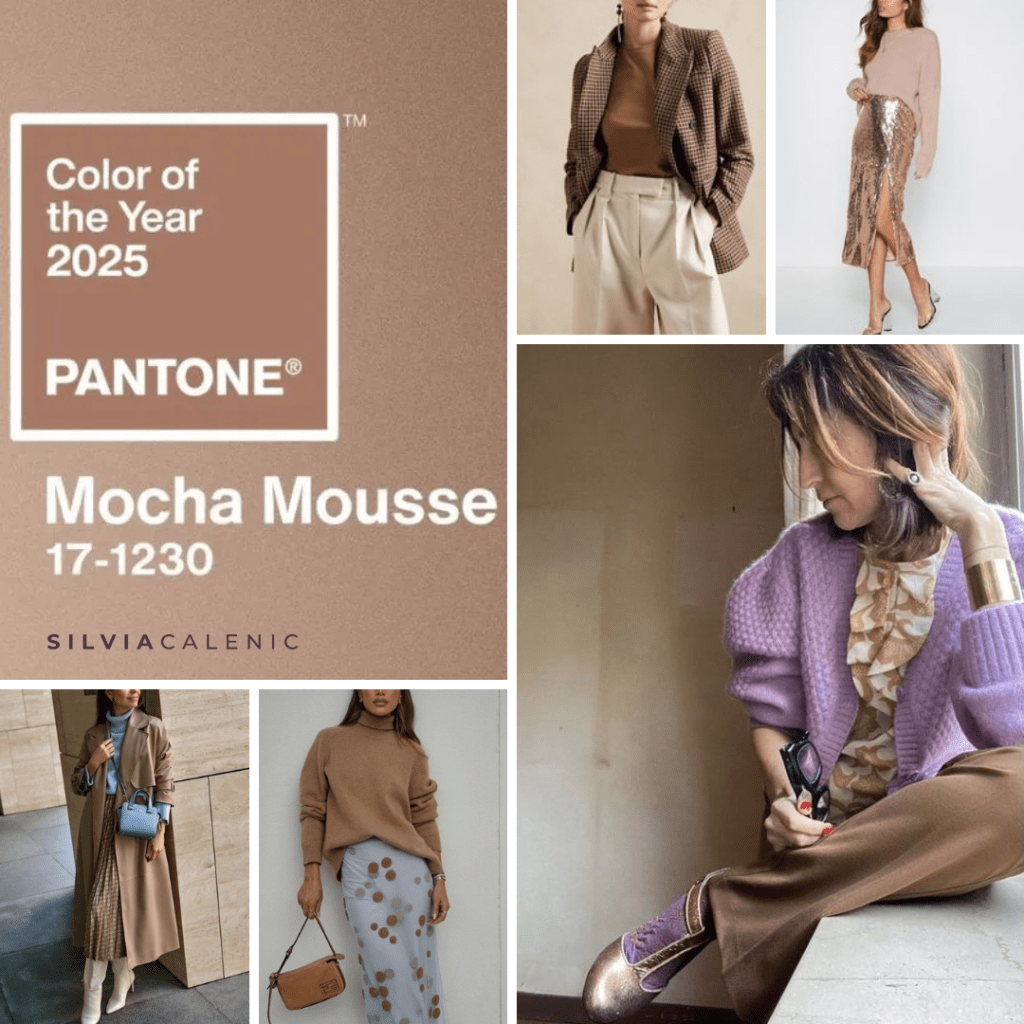 Per un look boho contemporaneo, combina Mocha Mousse con materiali come velluto stropicciato o frange. I gioielli in ottone o con pietre naturali, come l’agata o l’ambra, completano il mood. Consiglio: Sperimenta con sovrapposizioni, mescolando Mocha Mousse con tonalità come cipria, avorio o verde oliva per creare profondità visiva.